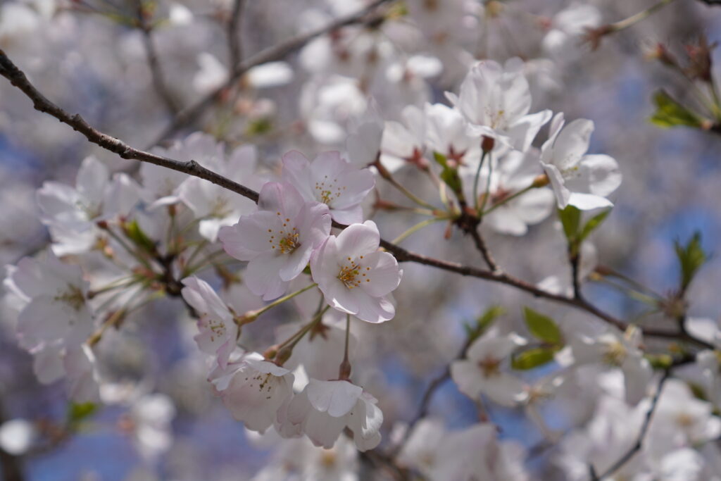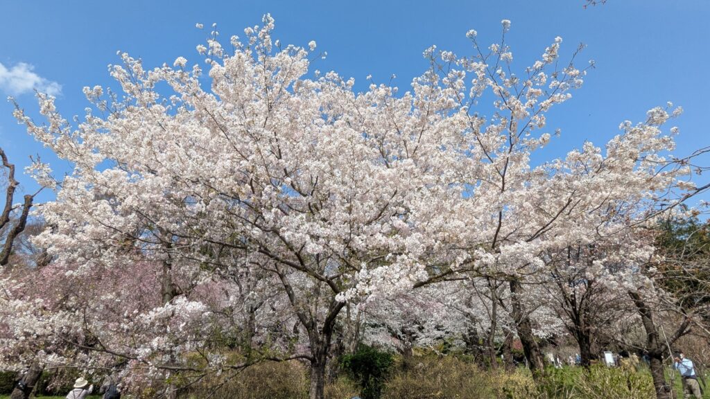 神代植物公園のサクラ園には、約60品種・750本もの桜が植えられていて、早咲きから遅咲きまでさまざまな桜を楽しめるのが魅力です。私が訪れた日も、ソメイヨシノやヤエザクラがちょうど見頃を迎え、白や淡いピンク、濃い紅色など、色とりどりの花がまるで花のグラデーションのように咲き誇っていました。