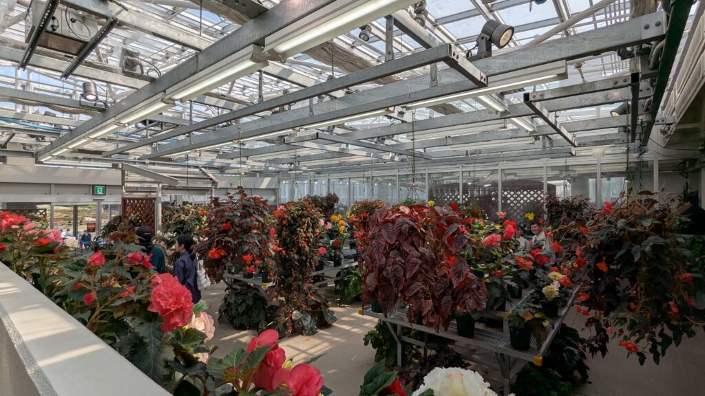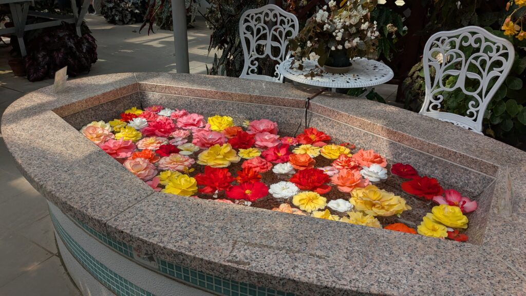 中でも印象的だったのが、ラン室の華やかさ。繊細で上品なランの花が、まるで宝石のように並び、ひとつひとつに見入ってしまいます。さらに、ベゴニア室では大小さまざまなベゴニアが咲き誇り、緑と花のコントラストがとても美しく、写真映えも抜群です。