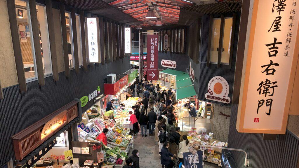 ホテルに荷物を預け、ホテルから徒歩数分の場所にある「近江町市場」へ向かいます。
