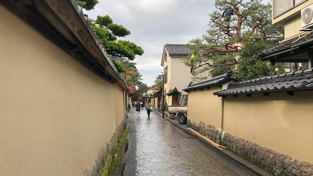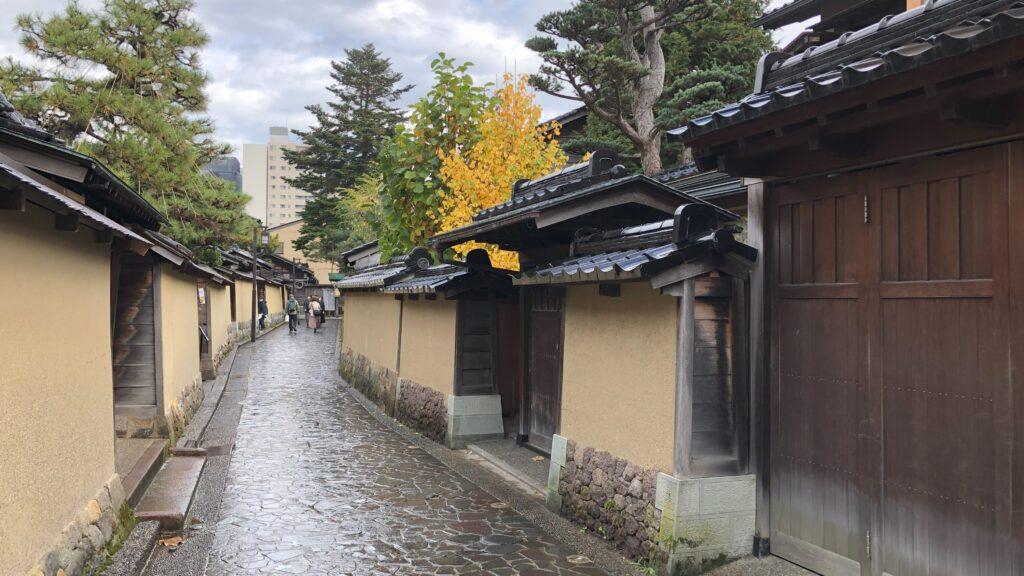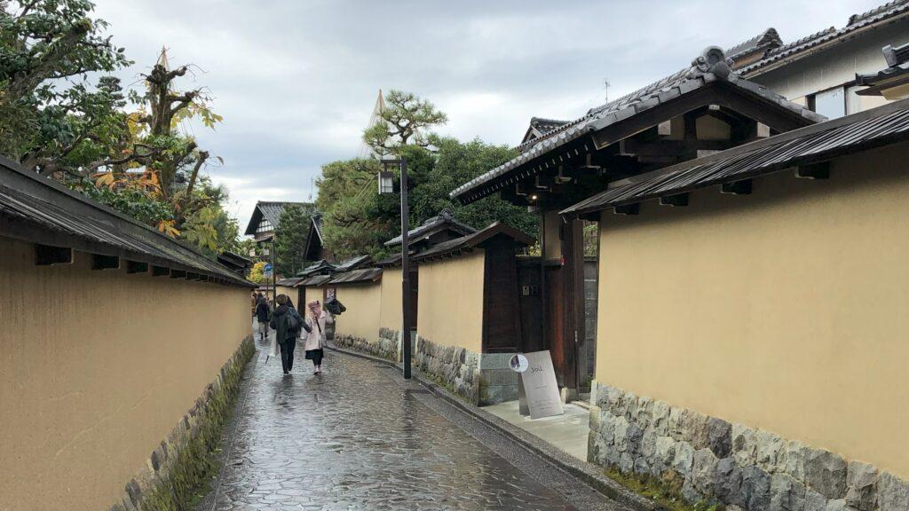路地には、昔ながらの木造建築の家が立ち並んでいて、これから訪れる場所への期待が膨らんでいきます。このエリアは独特の風情が漂っており、金沢の歴史や文化に触れながら、風情豊かな街並みを楽しむことができます。