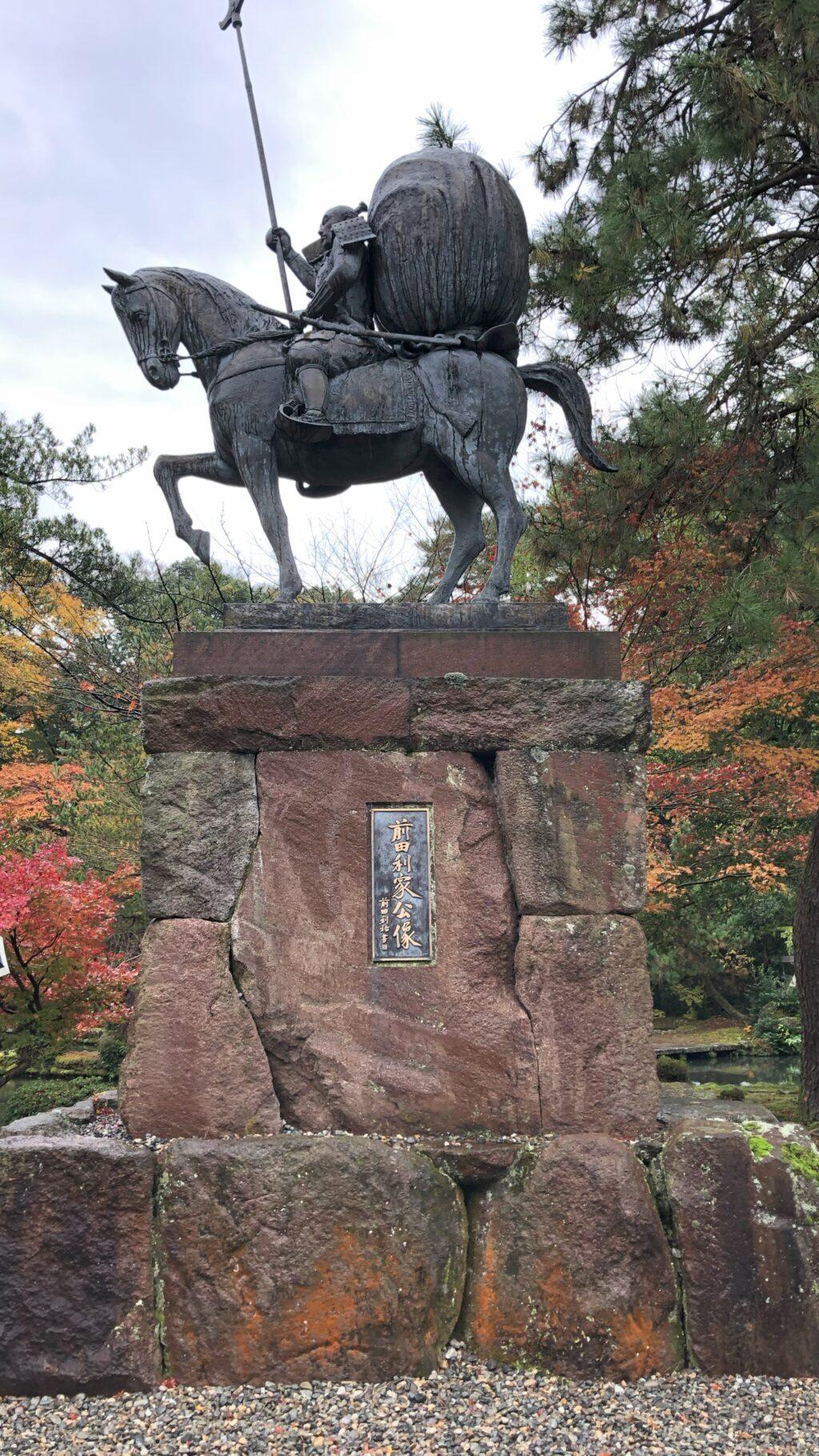 境内には前田利家公の銅像も。槍の名手だったとのこと、歴史の人物がぐっと身近に感じられます。