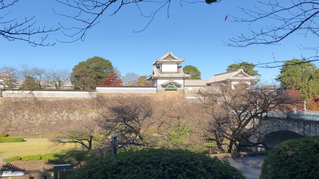 お堀通りを挟んだ向こう側には、前夜に訪れた金沢城公園が見えます。