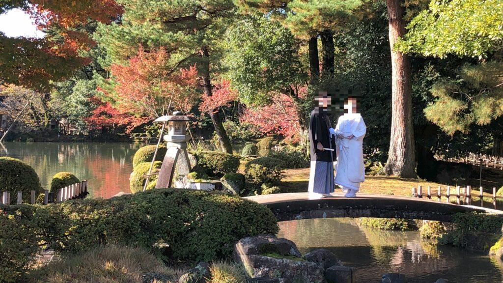 石川橋の前で結婚式の写真を撮っているカップルがいました。