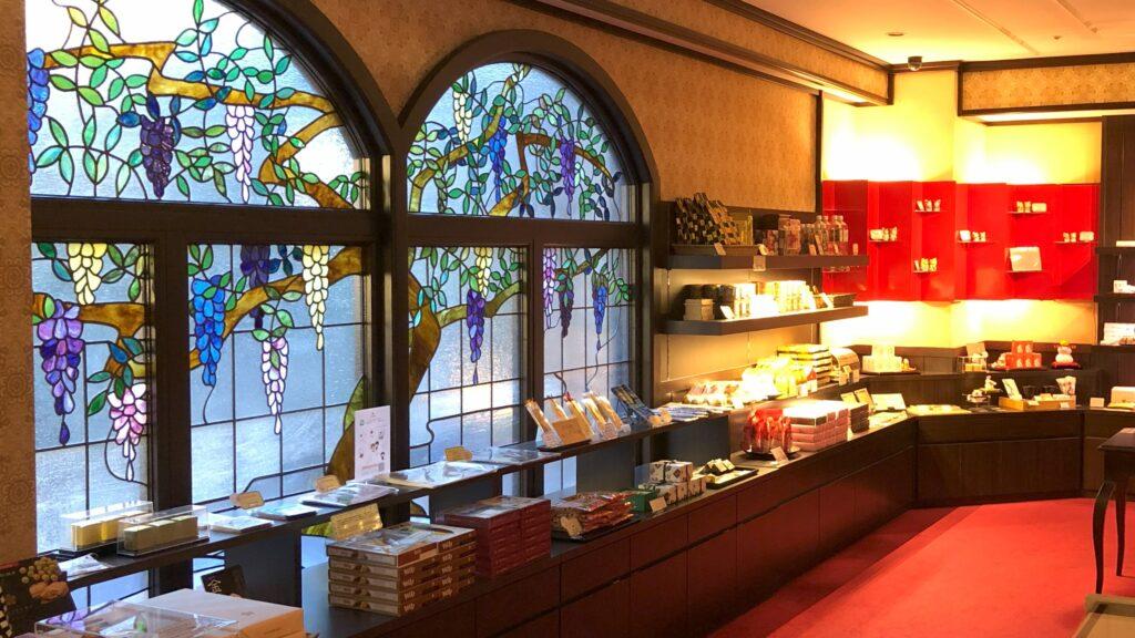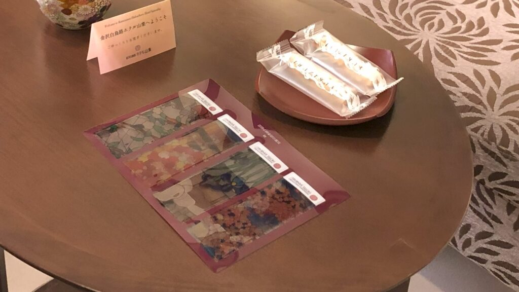 テーブルの上には、お菓子とホテル山楽オリジナルのステンドグラスしおりが置いてありました。しおりのデザインはロビーのステンドグラスをそのまま使用しており、とてもおしゃれです。