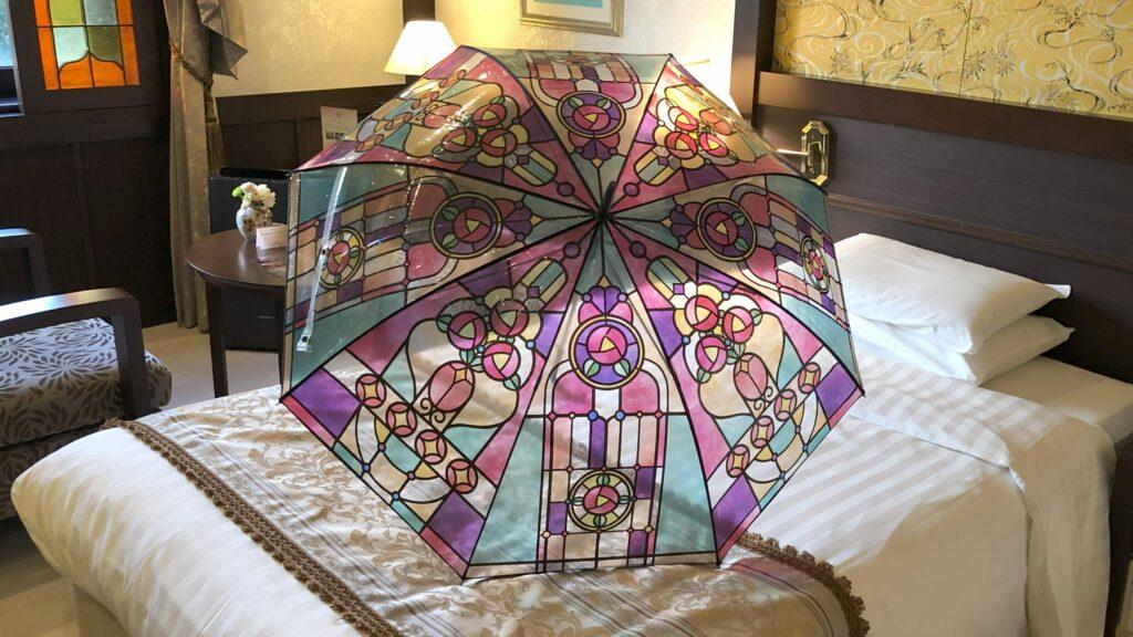 部屋のコーナーには、九谷焼のランプが置かれていました。金沢は雨の日が多いので、ビニール傘も用意されていました。しかも、その傘にはステンドグラス柄が施されていて、とてもおしゃれです。