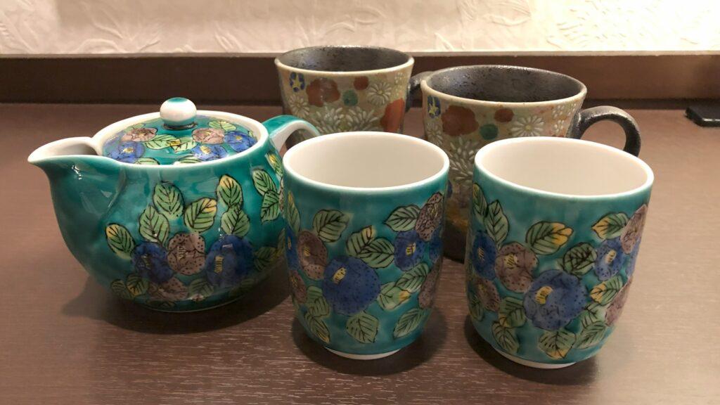 部屋には九谷焼の湯飲み、急須、そしてマグカップが用意されていました。マグカップの柄が気に入ったので、売店でペアマグカップをお土産として購入しました。部屋にあったマグカップとは色調が異なります。金沢を思い出しながら飲み物を楽しんでいます。