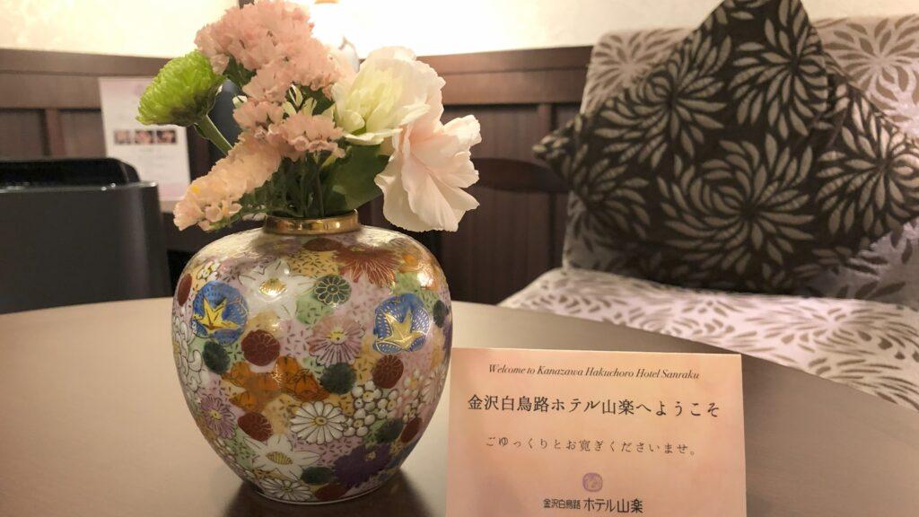 九谷焼の花瓶に生けられた花と、ホテルからのメッセージが置かれていました。部屋の随所におもてなしの心が感じられ、心温まるひとときを過ごせました。