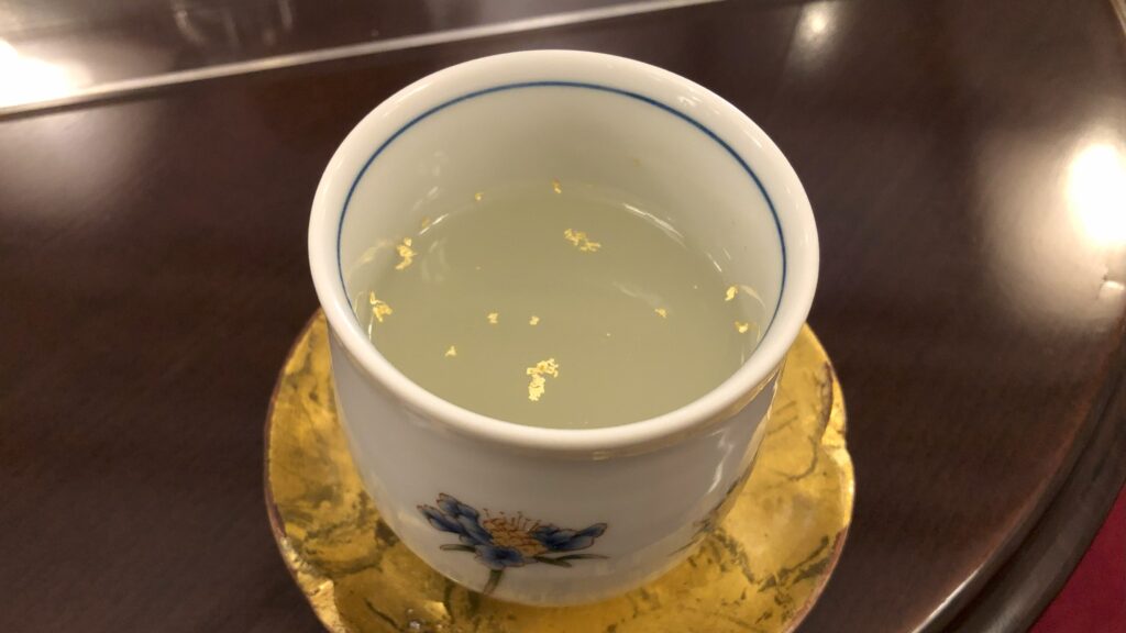 なんと、どちらのドリンクにも金箔が浮かんでいました。コースターもおしゃれで、ホテル山楽オリジナルのデザインです。売店でも同じコースターが販売されていました。贅沢なウェルカムドリンクで、特別なひとときを楽しめました。