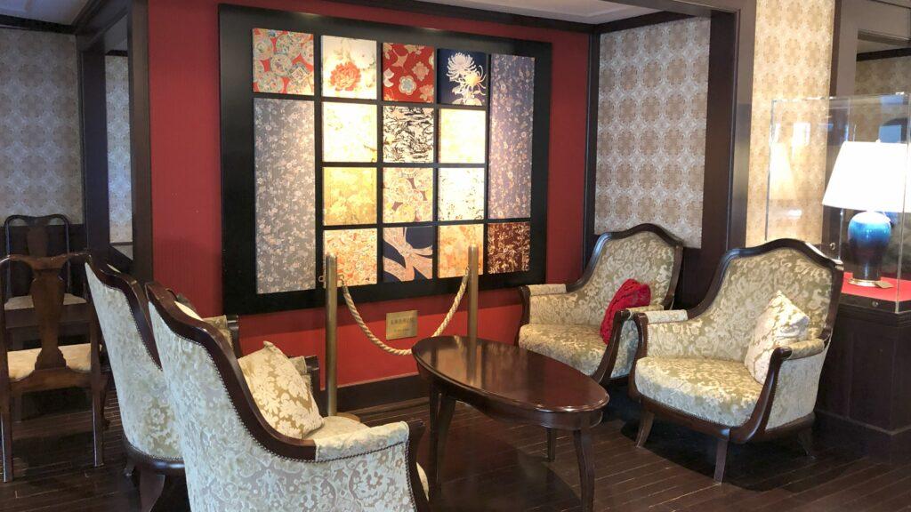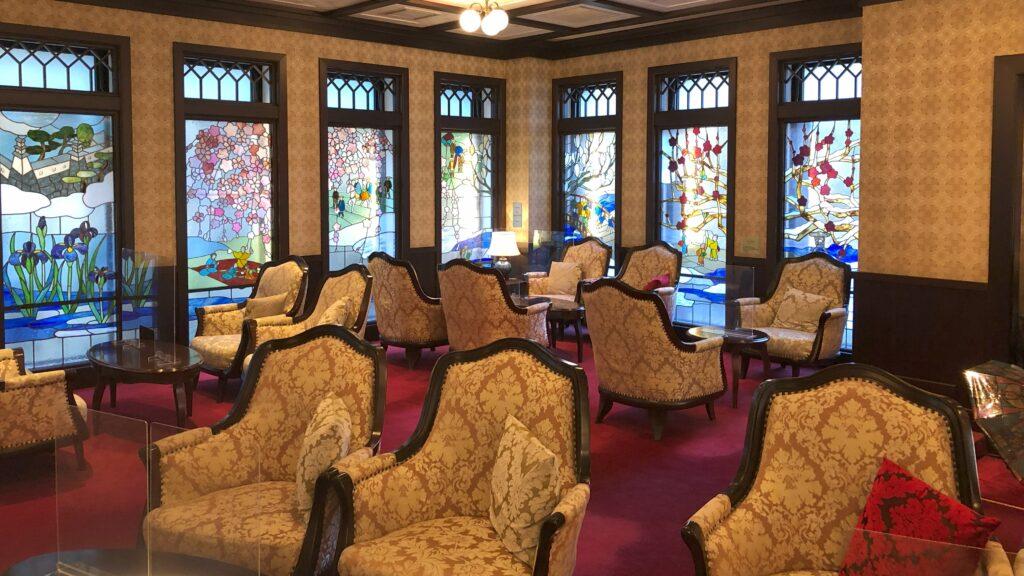 エントランスを抜けると、まるで別世界が広がります。大正ロマンのノスタルジックな雰囲気が漂い、優雅で格式高い印象を受けました。フロントとその奥に続くラウンジは綺麗で清潔感があります。ラウンジのステンドグラスの窓から差し込む光は、とても美しい光景です。