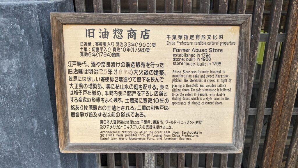 佐原の小野川沿いにある歴史的建造物。江戸時代に現在の地に移り、奈良漬の製造業や問屋業を営んでいた商店跡だ。1900年の大火で消失した後に再建された店舗と、1798年建築の土蔵が県の有形文化財に指定されており、周辺地区は重要伝統的建造物群保存地区に指定されている