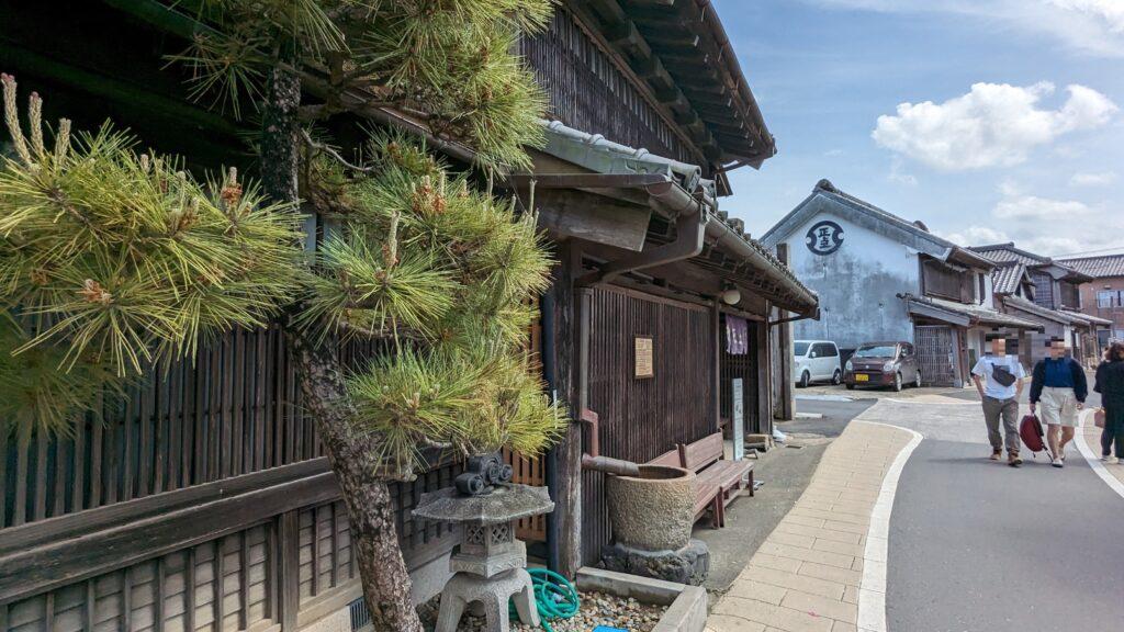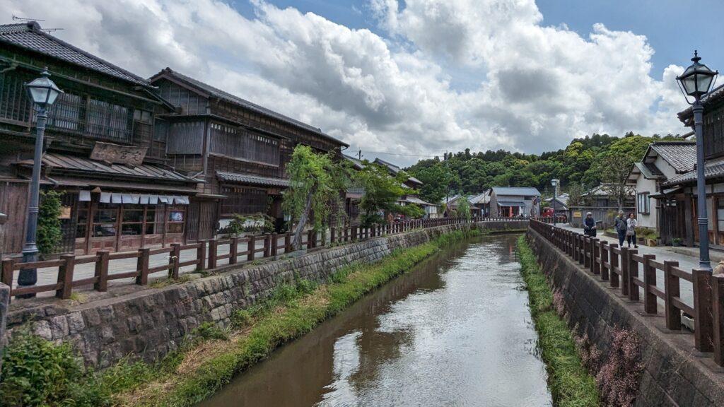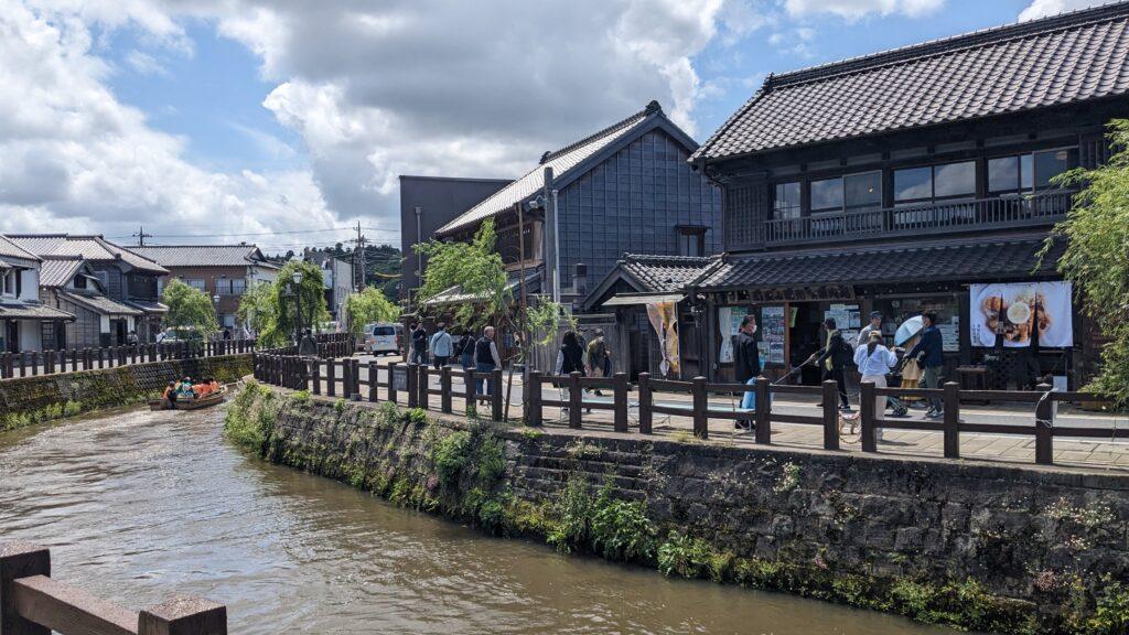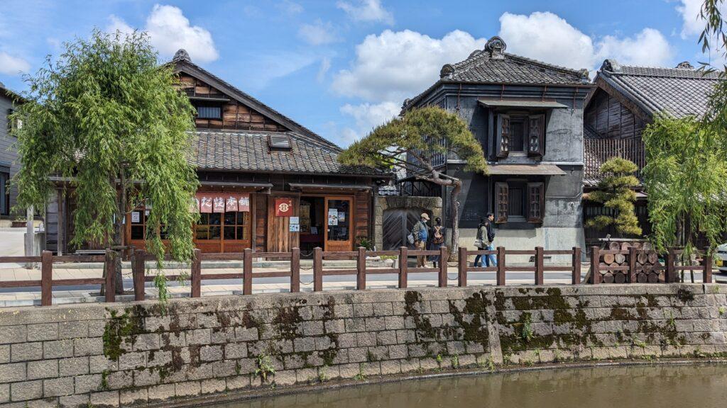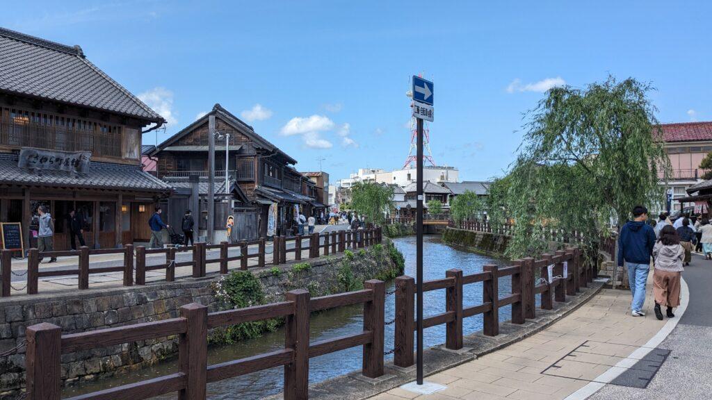 川の流れに沿って南へと進むと、歴史を感じさせる家々が並び、土蔵や木造の商家が続く通りには風情があります。