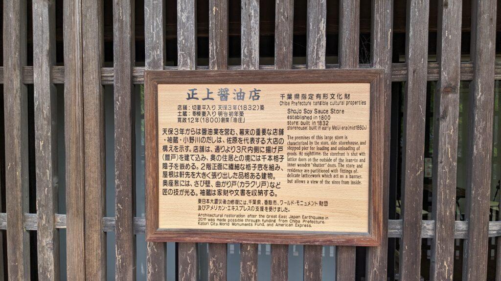 1832年(天保3)に建てられた佐原の老舗醤油醸造所は、町で最も古い建物で、隣の土蔵も明治初期の建築である。テレビドラマやCMの撮影にも使われ、店内には撮影された作品の写真が飾られている。創業は1800年(寛政12)で、現在の店主は10代目。主力商品は醤油と「いかだ焼」で、1958年(昭和33)からは自社の醤油で調理した佃煮も製造している。また、醤油をベースにしたさまざまな製品も取り扱っている。