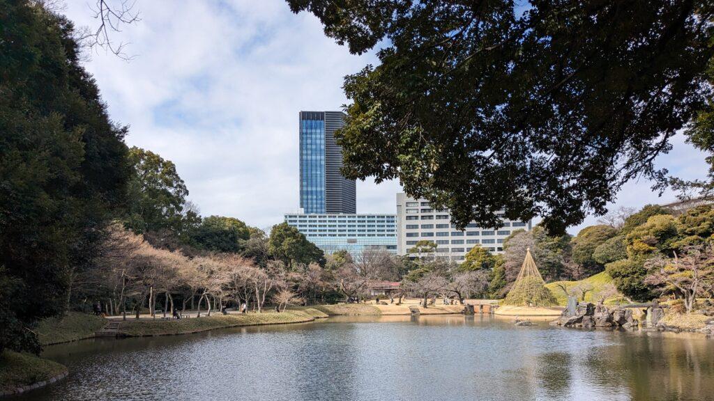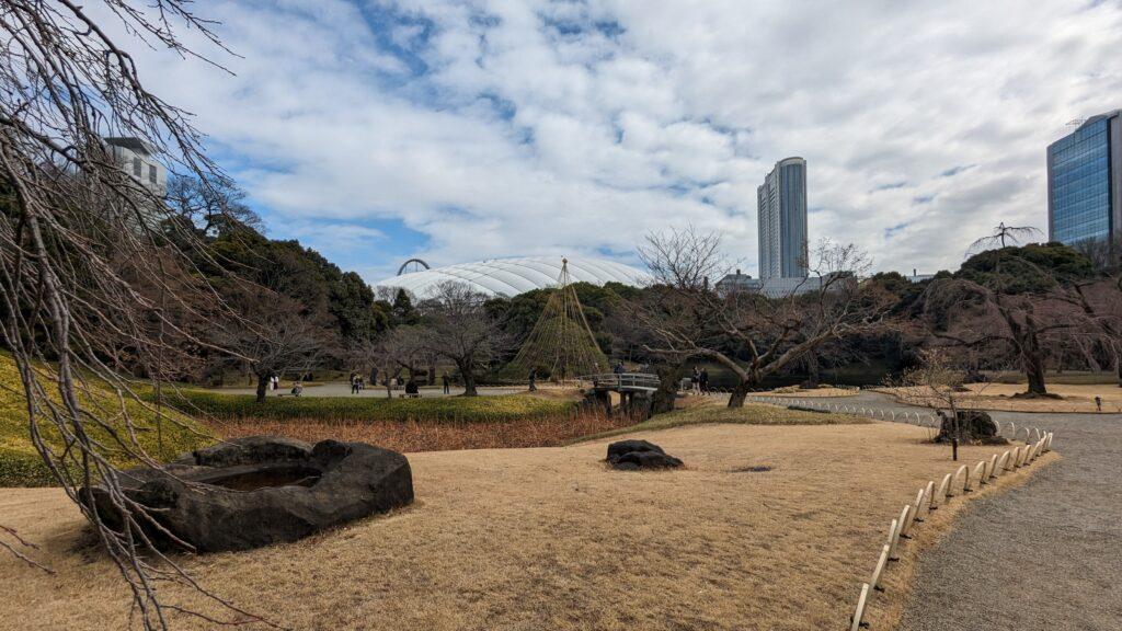 庭園の美しい自然景観の背後に、東京ドームホテル、東京ドームの屋根、東京ドームシティのジェットコースターが見えます。時代を超えた景色が交わります。