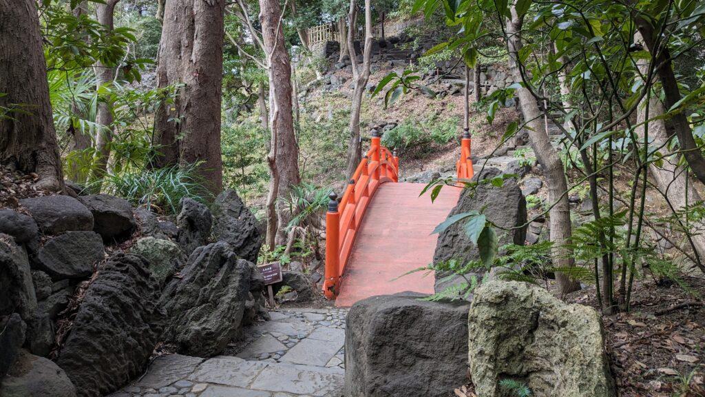 大きな橋ではありませんが、木々に囲まれた中で朱塗りの橋は目を引きます。