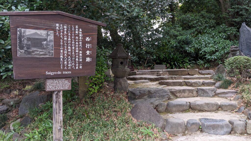 「大泉水」の南側沿いを歩いていると、右手に「西行堂跡」があります。