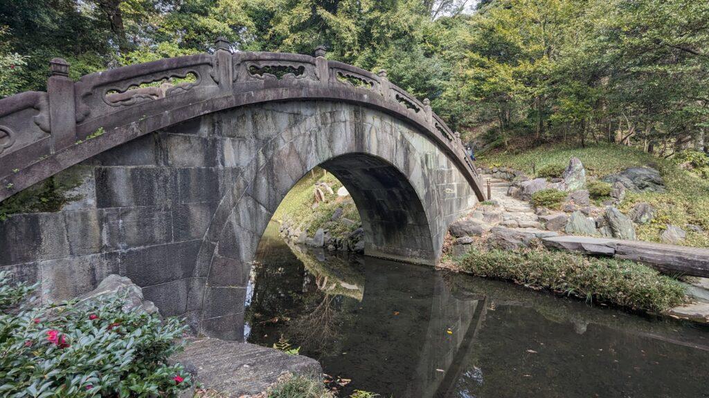 小石川後楽園の象徴的な石橋で、徳川光圀により明の儒学者朱舜水が設計した橋です。水面に映る形が満月のように見えることからその名が付けられました。