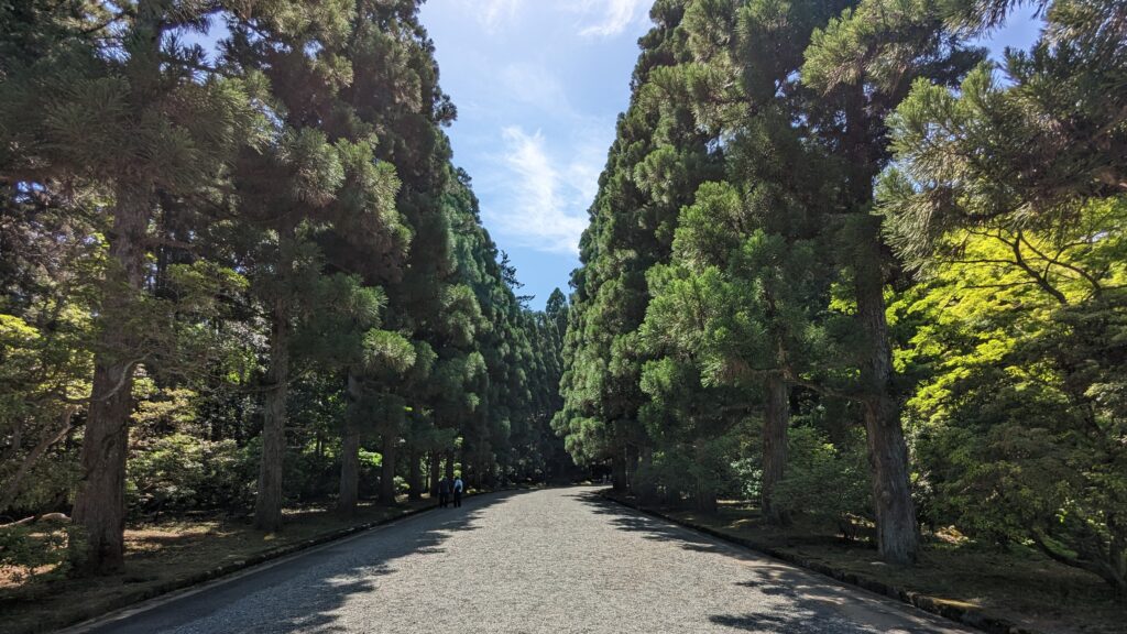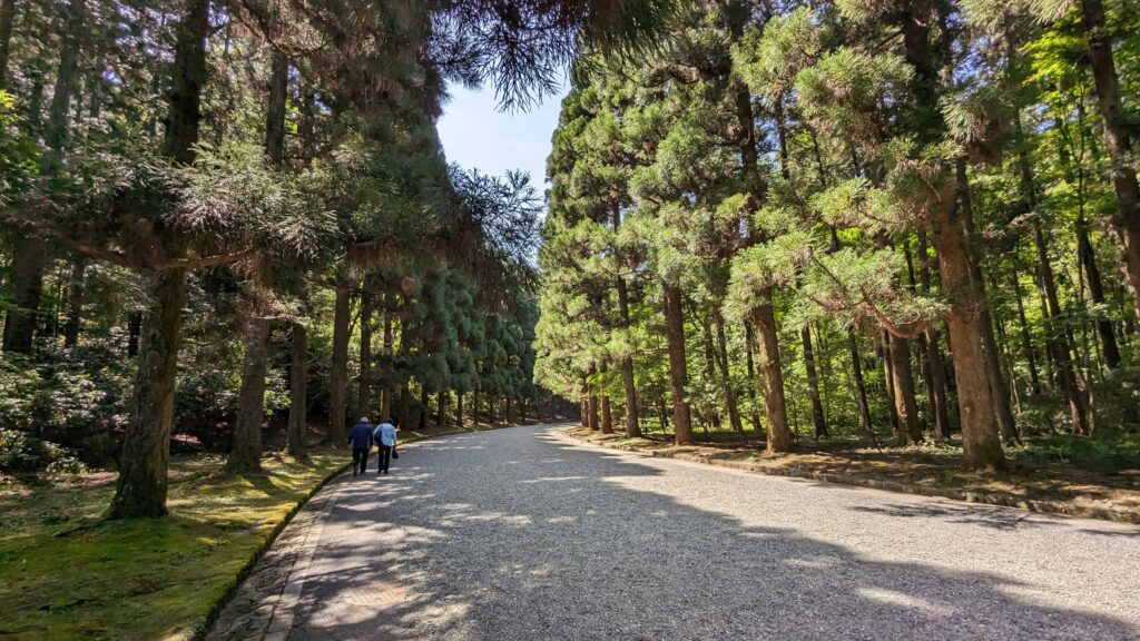 玉砂利が敷き詰められた道は、歩くたびに「ジャリ、ジャリ」と清々しい音を立てます。両側にはケヤキや北山杉が整然と立ち並び、空気がひんやりと感じられるほど。この荘厳な景観は、八王子八十八景にも選定されているそうです。