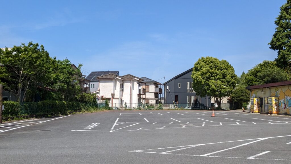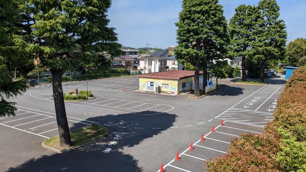 中央線を越える歩道橋に上って、駐車場を見下ろしました。