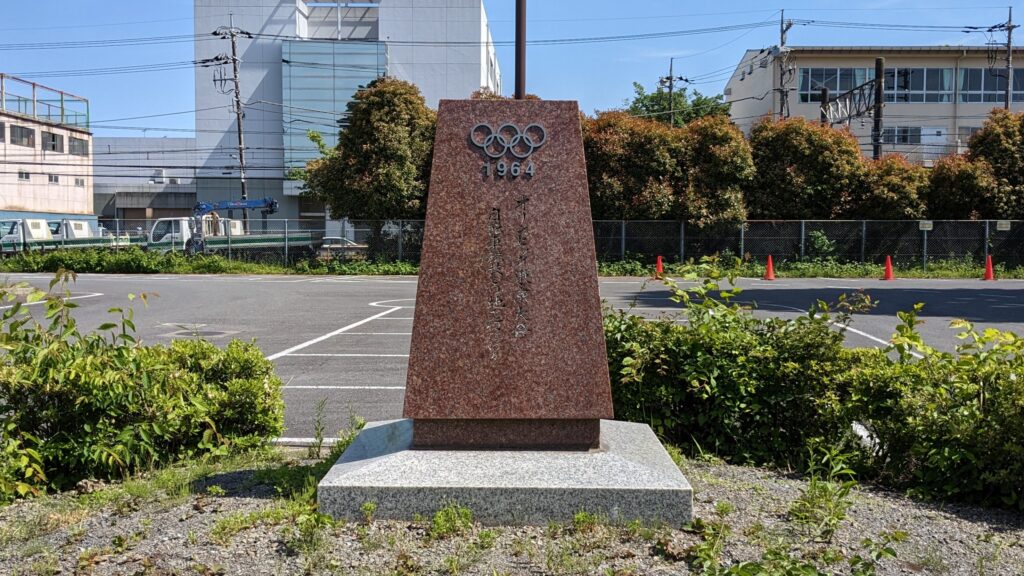 駐車場中央にある石碑には「1964 オリンピック自転車競技をこの地で行う」と刻まれています。