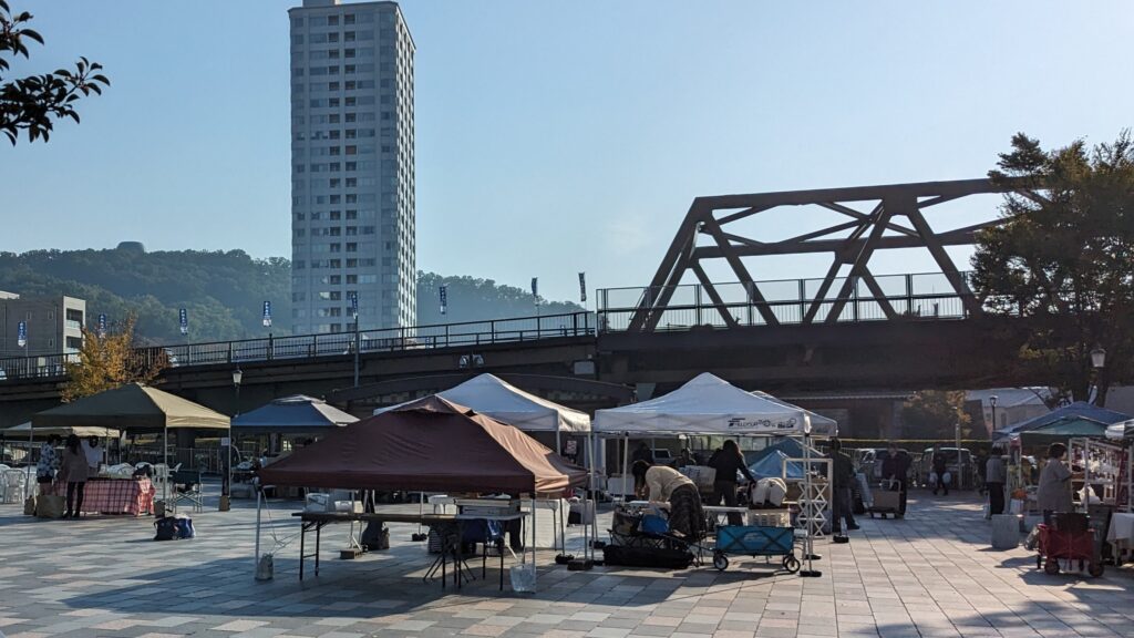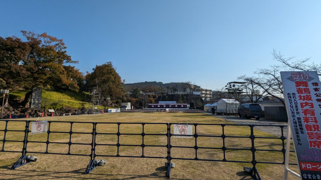 舞鶴城公園南広場です。こちらでも、お祭りに向けて準備が着々と進められていました。午後にはきっとたくさんの人が集まって賑わうことでしょうね。とても楽しみです。