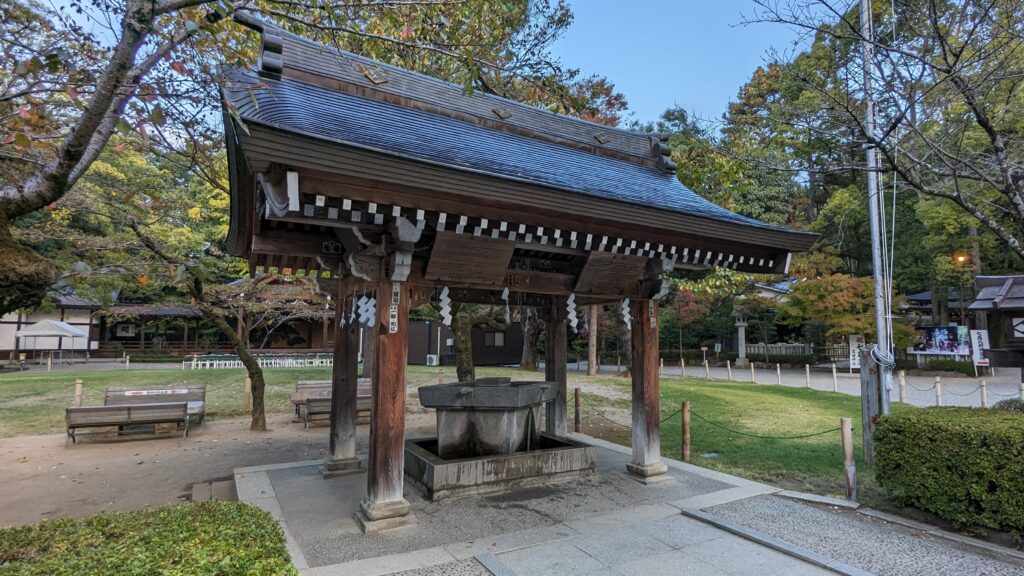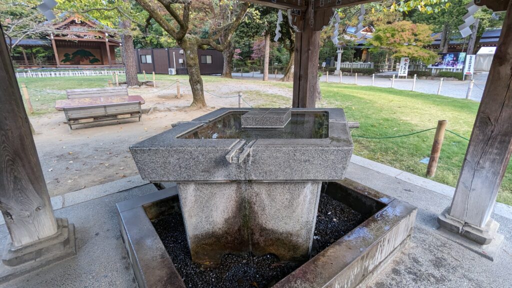 参道を進むと左手に見えてくるのが、珍しい「武田菱」の形をした手水舎です。このシャープで洗練されたデザイン、武田家らしくて本当にかっこいいですね。