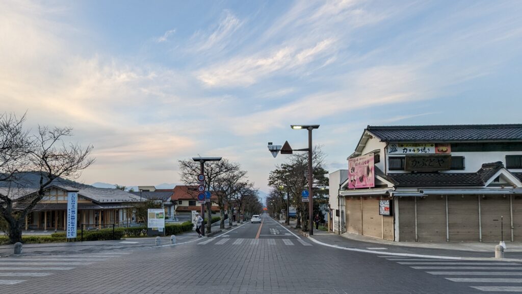 武田神社の前から甲府駅方面に向かって撮った一枚です。まっすぐな道がずーっと伸びています。