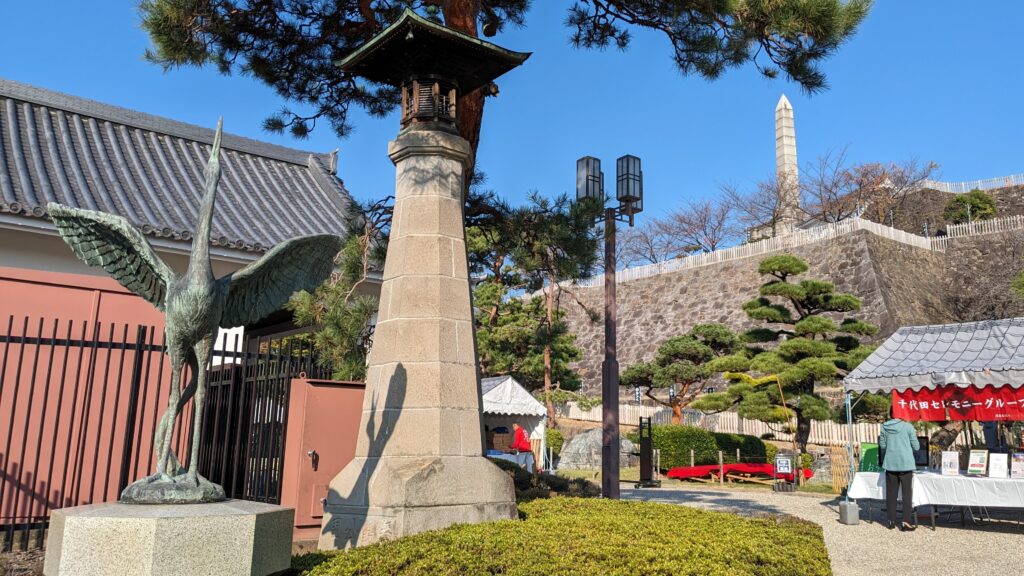 橋を渡り終え城内に入ると、舞鶴城を象徴する、鶴の像と灯篭が並んで建っています。