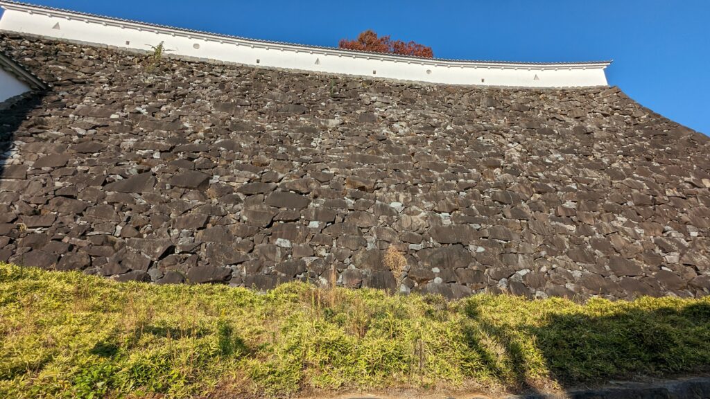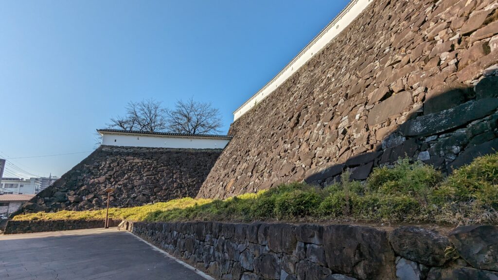 夢小路を抜け、踏切を渡ると現れるのが「甲府城(舞鶴城)」です。東側の石垣は、自然の石を加工せずに積み上げた「野面積み(のづらづみ)」で、高さは約17m。見上げるような巨大な壁には、圧倒的な迫力があります。