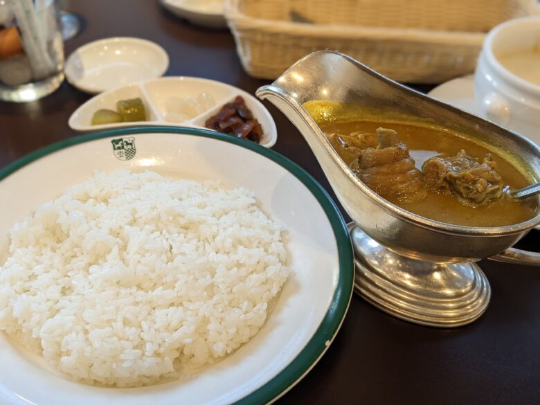 注文したのは中村屋本店の名物「インドカリー」ブ!骨付きチキンと大きなじゃがいもがゴロッと入っていて、口に運ぶとスパイスの香りが一気に広がるブ。ルーは調和が取れていて、辛さもほどよく絶妙ブ。チキンは柔らかくてホロリと食べやすく、薬味をおかわりして好みにアレンジできるのも魅力ブ!満足度の高い一皿だったブ!