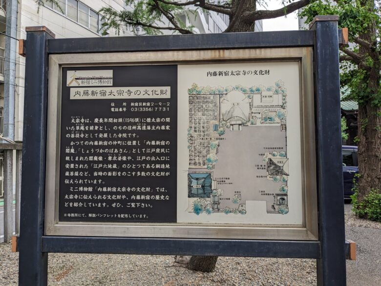 旧甲州街道沿いにある「太宗寺」は、内藤家の菩提寺。慶長元年(1596年)創建の草庵が起源で、江戸六地蔵の一つや内藤正勝のお墓、文化財としても貴重な銅造地蔵菩薩坐像など、歴史ファンには見逃せないスポットです。新宿駅の喧騒から一歩入ると、ここだけはまるで時間が止まったかのような静けさ。歩き疲れた足と心を優しく癒してくれます。