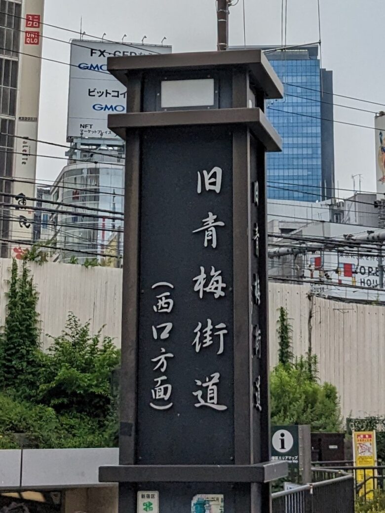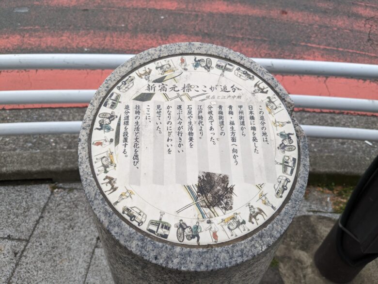 旧青梅街道の案内支柱がJR新宿駅北側にありました。