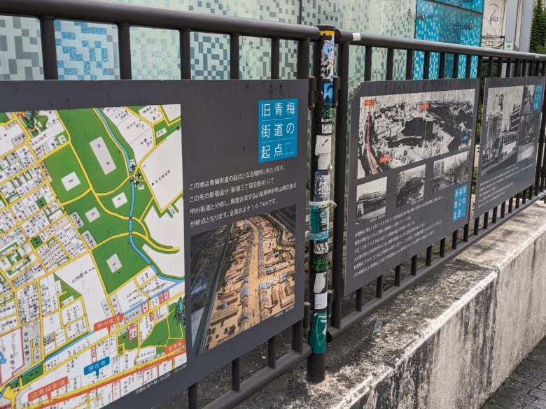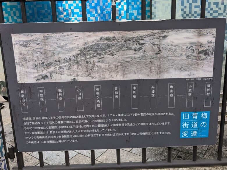 旧青梅街道は、先ほど通ってきた甲州街道ととの分岐点である「新宿追分」から始まり、青梅を経由して山梨県甲府市の甲州街道の酒折追分まで続いています。