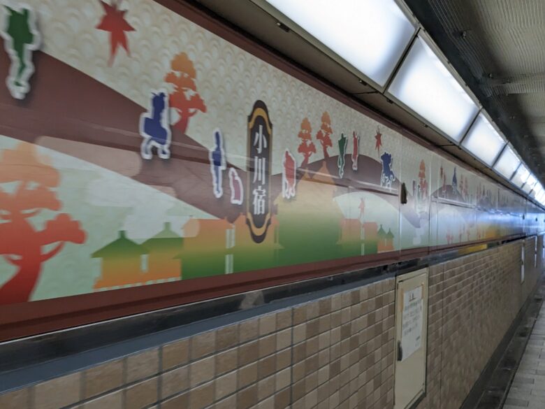 案内支柱の先にある線路をくぐるトンネルの壁には、青梅街道の各宿場を紹介する絵が描かれています。行きたいところ、やりたいこと増えていきますね。