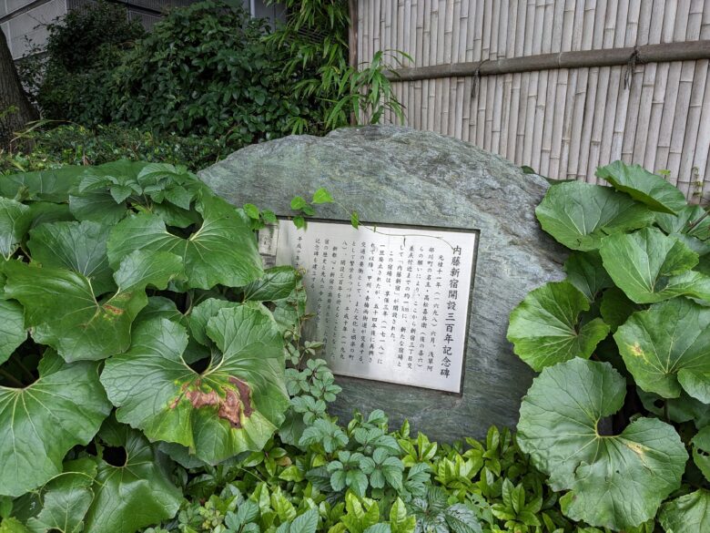 そのまま新宿駅方面に進んで「新宿御苑 旧大木戸門衛所」に向かう途中の草むらに「内藤新宿解説300年記念碑」があります。現在の新宿の原点は300年前に出来上がったのです。