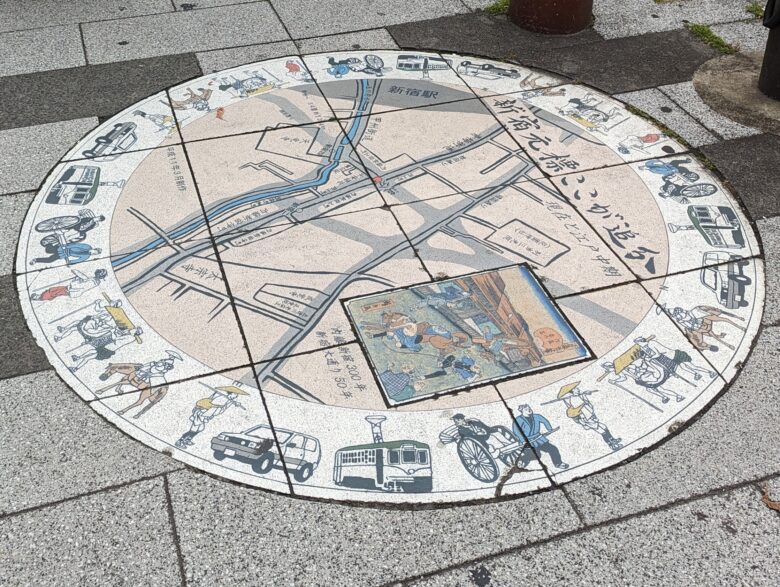 ここ「新宿追分」は、甲州街道と青梅街道の分岐点であり、現在の新宿3丁目交差点がその跡地になります。