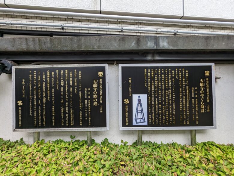 天龍寺の「時の鐘」は、江戸時代の内藤新宿に時刻を知らせるために使われた鐘で、江戸三名鐘の一つとされているんだブ。この鐘は三代目で、多摩郡谷保村の関孫兵衛の鋳造なんだブ。