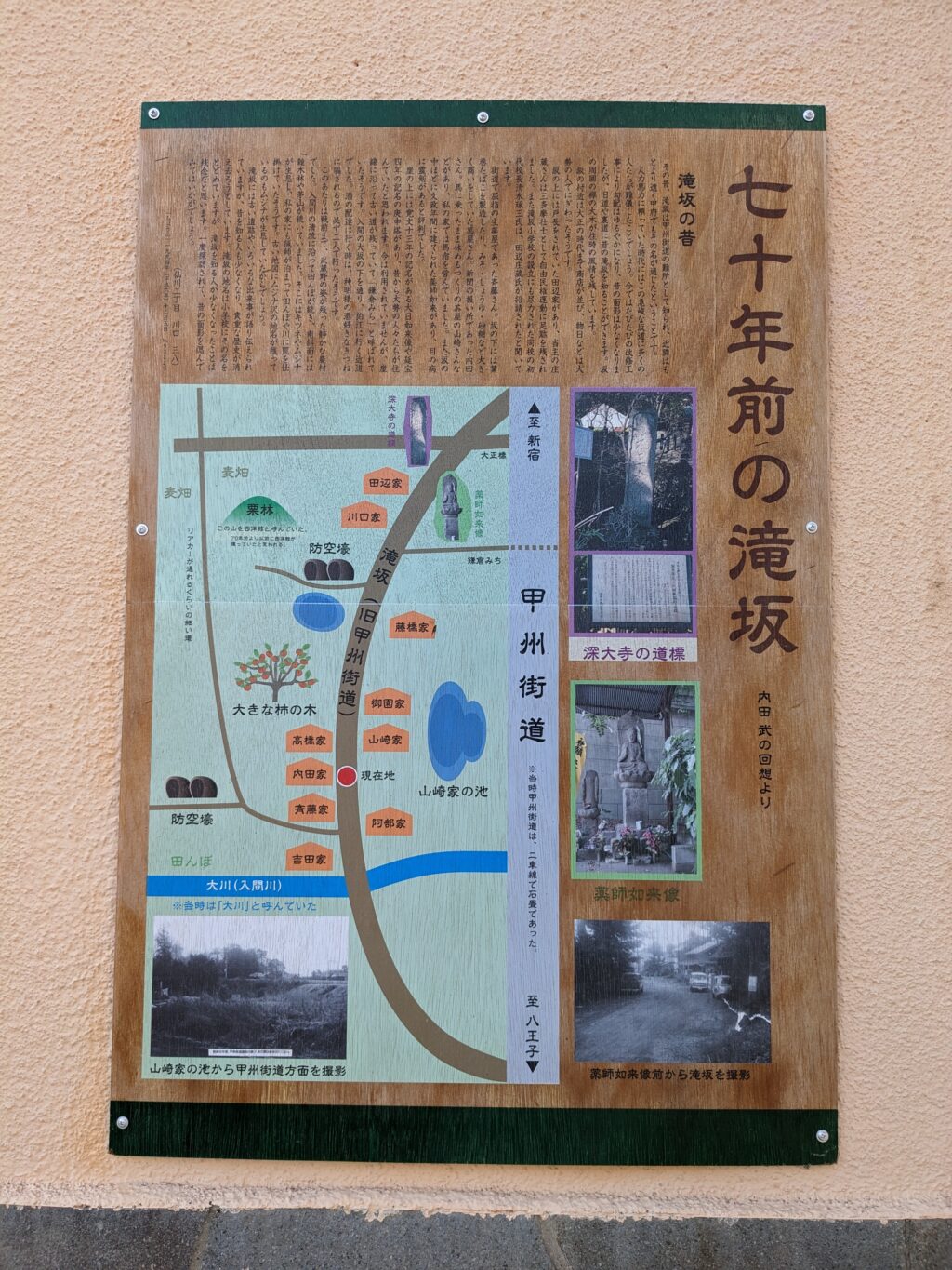 滝坂の頂上にある川口家は今も滝坂旧道への分岐点に残されていて、現在も人々の目印となっています。「70年前の滝坂」という案内板がありました。