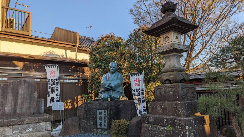 中央自動車道と交差する少し手前の西光寺には、門前に近藤勇の座像がありました。