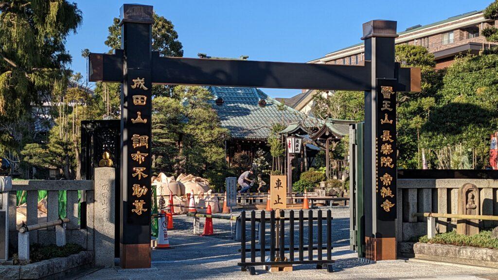 次の駅の布田駅前交差点には「調布不動尊」があります。立派な冠木門が目を引きます。