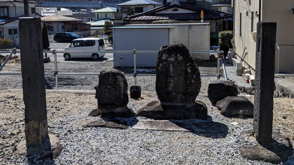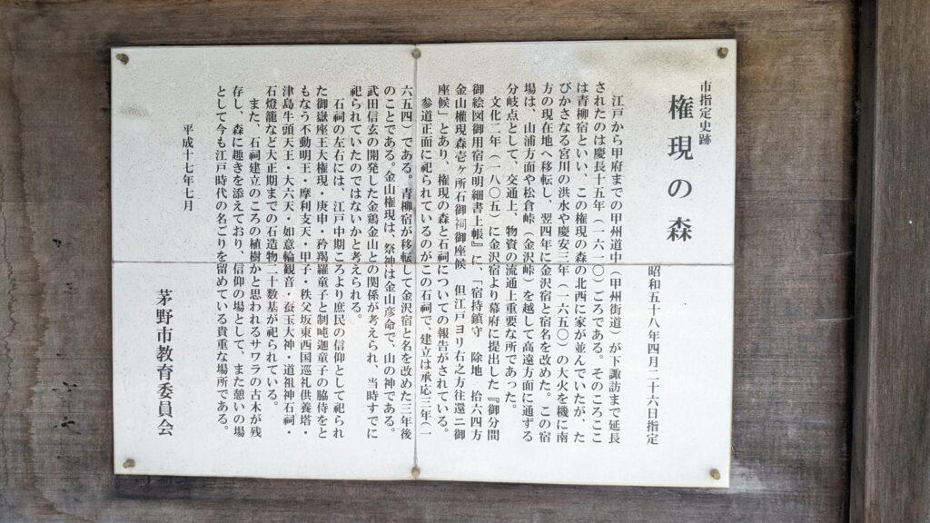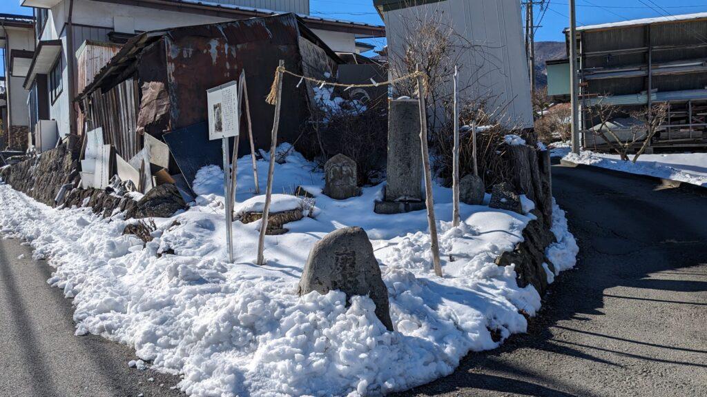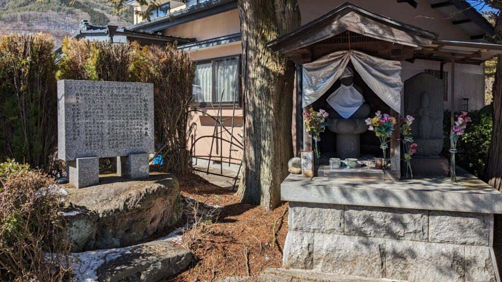 昔はこの森の北西に家が並んでいたんだけど、宮川の洪水や慶安三年の大火があって、南の現在地に移転したんだブ。この宿場は高遠方面に行くのにとっても重要な場所だったんだブ。交通や物資の流通にとって欠かせないんだブ。市の指定史跡になってるんだブ。