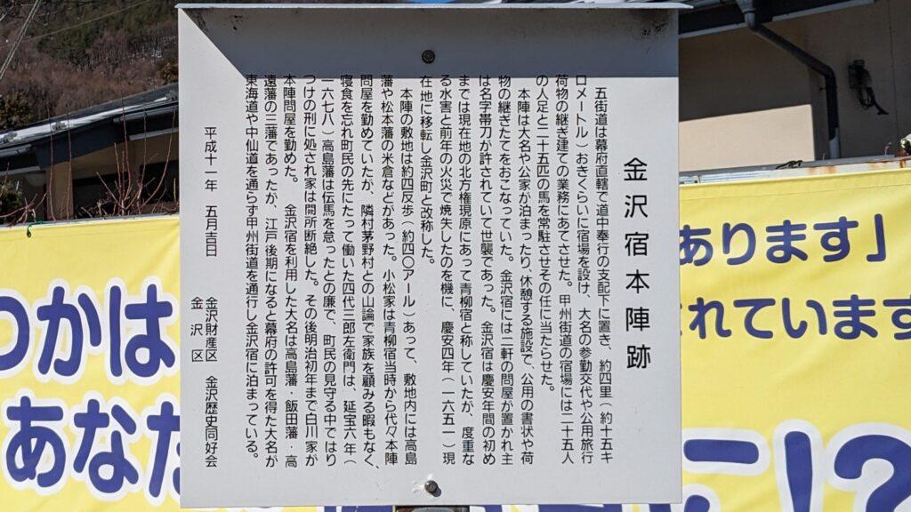 本陣が一軒、旅籠が十七軒もあったんだブ。最初は宮川と矢ノ川の扇状地、権現原平に位置していて、その時は「青柳宿」って呼ばれていたんだブ。でも、何度も水害に遭い、とうとう大火で宿場が全焼してしまったブ。その時をきっかけに、慶安四年(1641年)に現在の場所に移転し、名前も「金沢宿」に変わったんだブ。