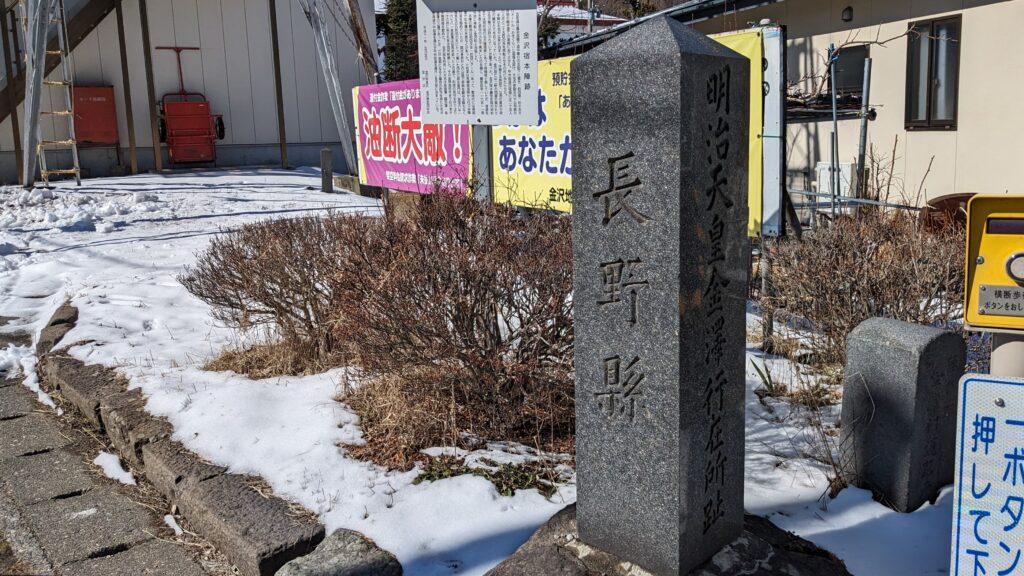 「明治天皇金澤行在所跡」と刻まれた小さな石柱があり、 その奥に「金沢宿本陣跡」の説明板があります。