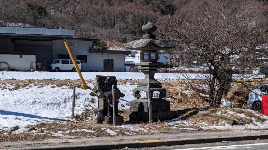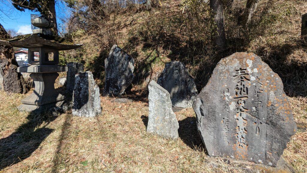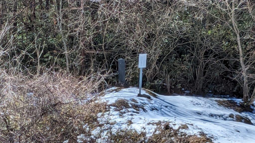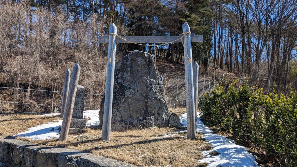 案内板の指示に従い坂道を進んでいくと、途中に鳥居と石碑、そして立派な御柱(?)が目に入りました。不思議なことに案内板や説明が見当たらず、石碑に刻まれた文字も風化のためかほとんど判読できません。