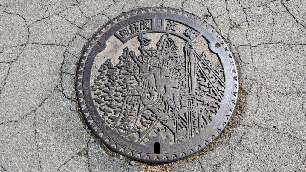 坂道を歩いている途中で見つけたマンホール。デザインが「御柱祭」をテーマにしていたので、思わず一枚写真に収めました。