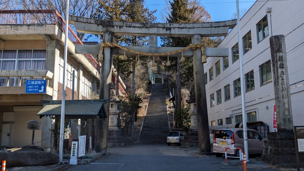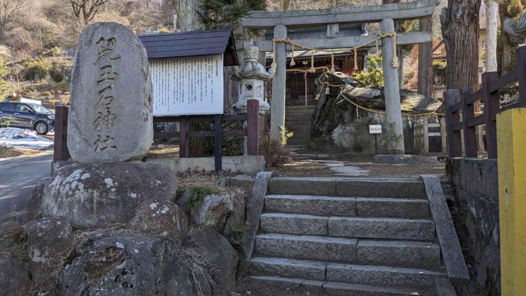 ここからまた緩い上り坂が続きます。S字カーブを登る途中、細い路地の先に「児玉石神社」を発見!この境内にある五個の大石は、「諏訪の七石」の一つに数えられる神秘的な場所です。