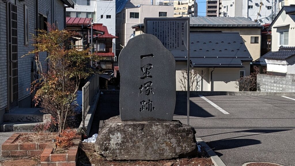 さらに歩みを進めると、突然、駐車場の隅にぽつんと現れたのが、江戸日本橋から五十二里目の「片羽一里塚」跡!