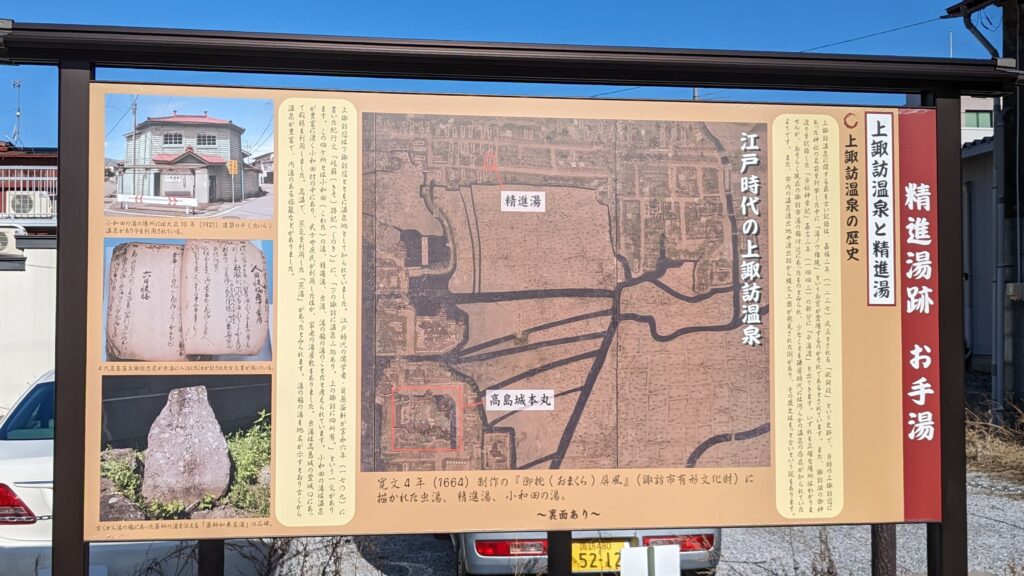 お手湯の前の駐車場には、かつて本陣も兼ねていた「上諏訪宿問屋跡」の案内板が立っていました。残念ながら形跡はありませんでした。残念。