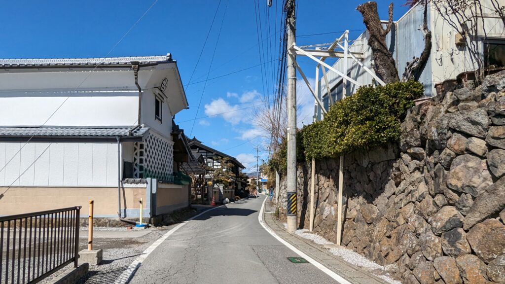 いよいよ旅の最終目的地である下諏訪宿へ向かう道に入ります。駅からの旧甲州街道は、ここで国道20号線と一度お別れ。山沿いの、静かな旧道へと足を踏み入れました。