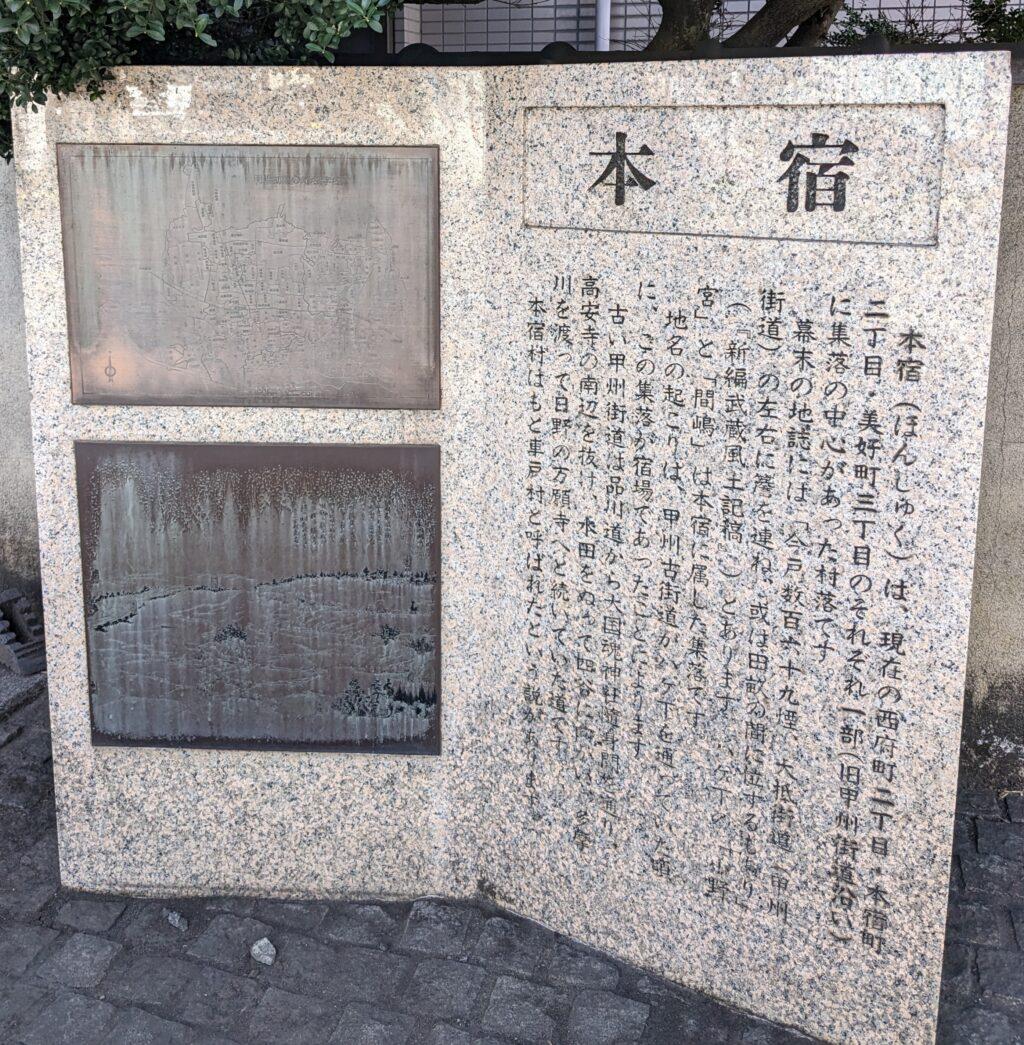 「本宿跡」の石碑があります。「本宿は現在の西府町2丁目・本宿町2丁目・美好町3丁目のそれぞれ一部(旧甲州街道沿い)に集落の中心があった村落です。」と記されています。