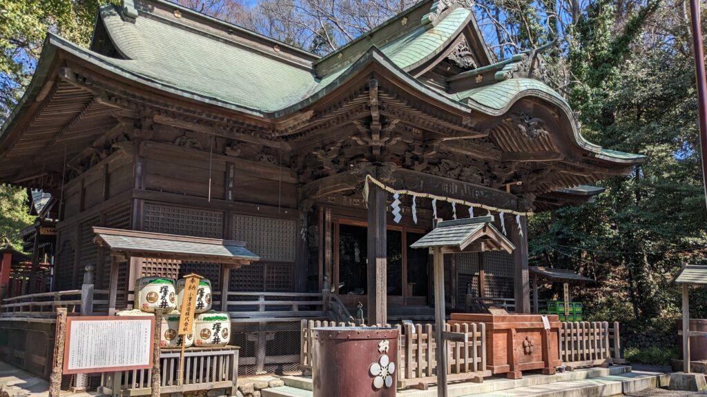 本殿は北向きで、ちょっと珍しいつくりになっているんだブ。神社に続く参道や馬場大門のけやき並木は、国が指定した大切な天然記念物なんだブ。これ、源頼朝と義家が植えたって言われてるんだブ。